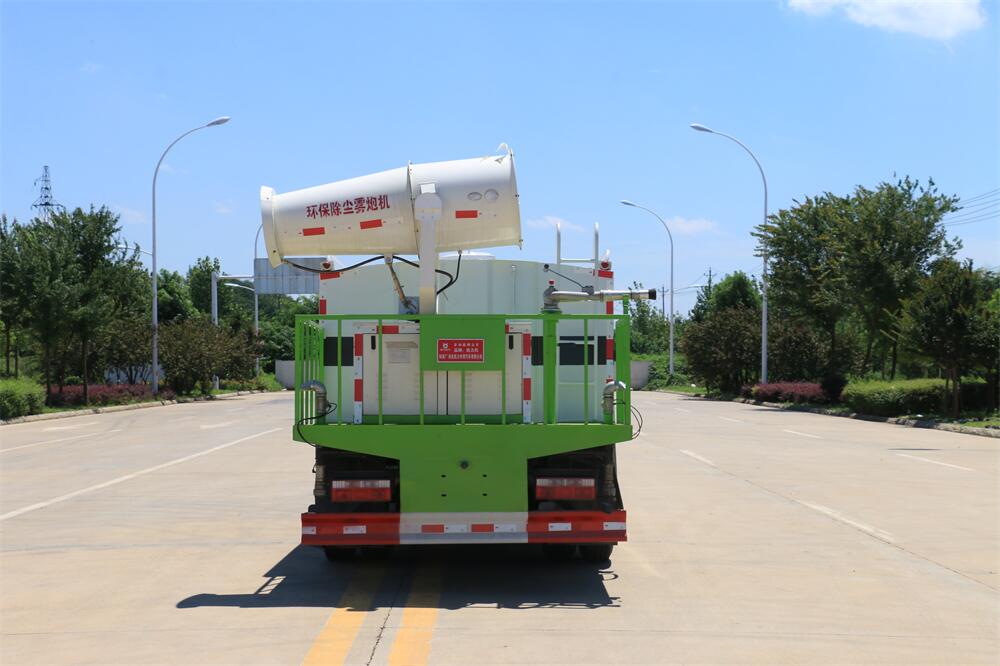 上裝配置:罐體容積為 16立方,選配風送式霧炮機組射程30米、40米、50米、60米、80米、100米、120米霧炮,罐體鋼板為4mm碳鋼Q235材質,罐內隔板具有防波作用,以減輕汽車行駛時罐體液體沖擊,罐體及整車外形尺寸按照公告。帶大功率專用灑水泵,泵可自吸自排,整車前沖、后灑、側噴、帶65消防接口,后平臺配CLW-50、CLW-60、CLW-80、CLW-100、CLW-120型風送式霧炮機組;罐體前封頭配大功率柴油發電機組;前封頭帶水位計,后平臺主管路帶1寸澆花接口,后爬梯。帶兩根輸水管及陰陽端。罐體顏色:銀/灰/綠,罐體兩側噴“多功能抑塵車”字樣,貼反光標示。
